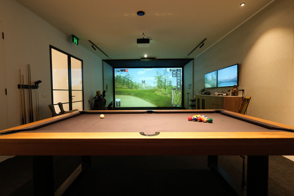 Golfsim Australia did all the design in house to ensure the space was aesthetically pleasing as well as functional. Acoustic Autex panelling lines the entire wall on the right of the simulator. There is a laser etched pattern across the panels in a soft cement colour that mimics rammed earth. This entire wall along with the wood veneer hub panels behind the television create an acoustically pleasing environment with minimal echoes.